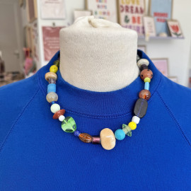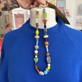 Après des années d’accumulation de perles et autres colliers vintage dénichés en vide-greniers, brocantes et autres Emmaus, j’ai fini par créer mon collier de rêve. Cet accessoire qu’on peut porter à toutes les sauces, qui habillera n’importe quelle tenue et nous fait toujours plaisir.