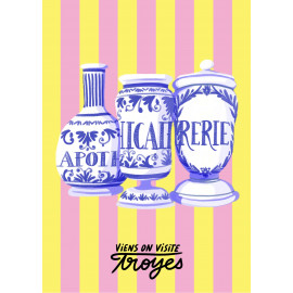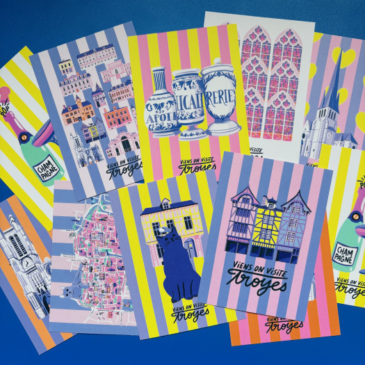 Cartes postales issues de mon City Guide « Viens on visite Troyes ». Illustrations par Julie Céré, aka, Youlie dessine.