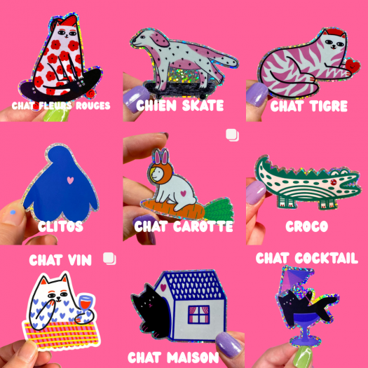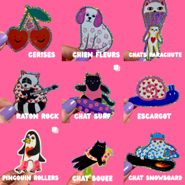 Illustrations uniques à porter sur soi, qu'elle dessine une par une, signe au dos, assemble et package entièrement à la main.