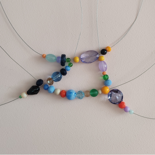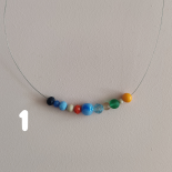 Collier de petites perles multicolores en verre et acrylique montées sur un câble acier.